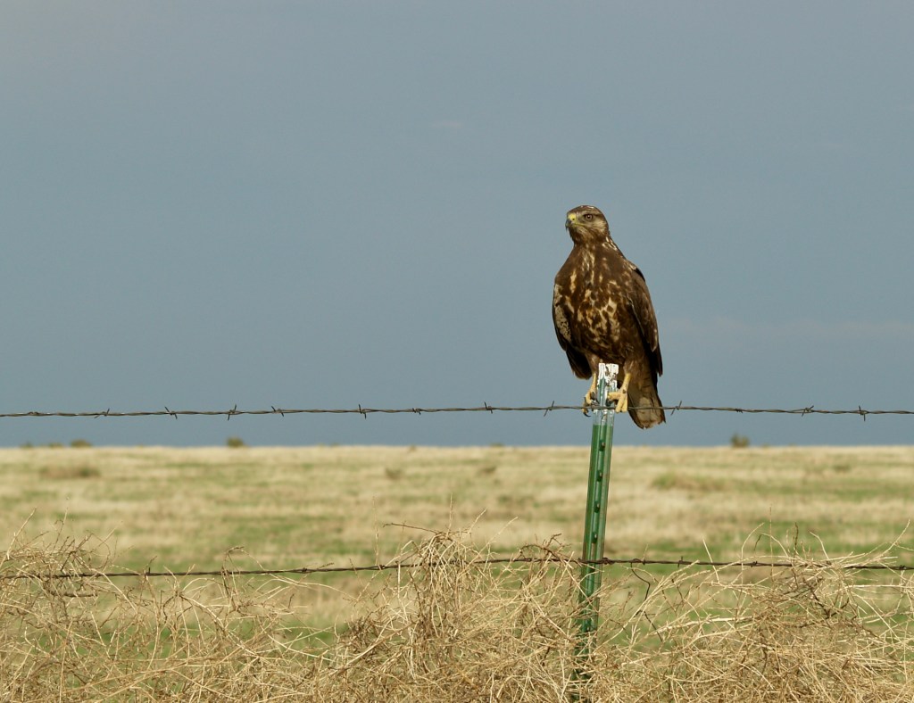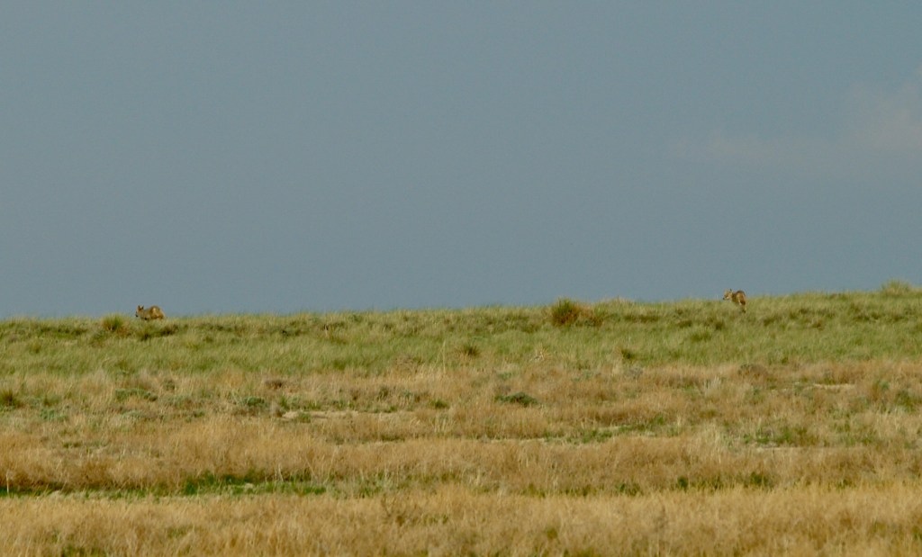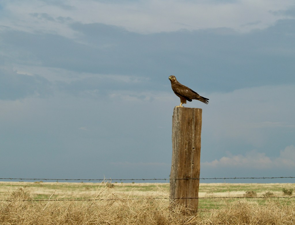 Two coyotes, likely a mated pair. Coyotes are hunted in Colorado and are wary of vehicles. I took this photograph at a distance with a 150mm lens.A pair of hawks perched on the fence posts.A pair of hawks perched on the fence posts.A songbird resting on a cactus