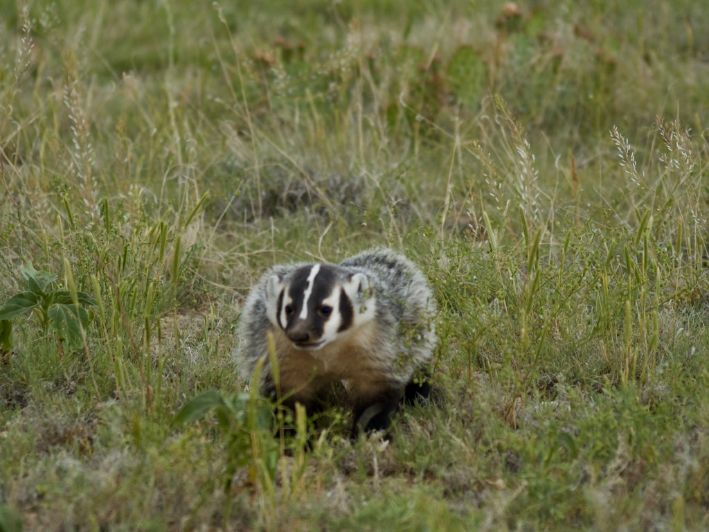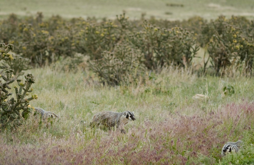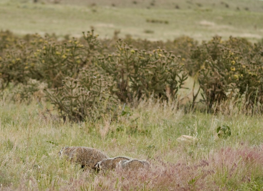 While driving through the pastures, I came across a mother badger and her two kits. I took these photos from my car with a telephoto lens.