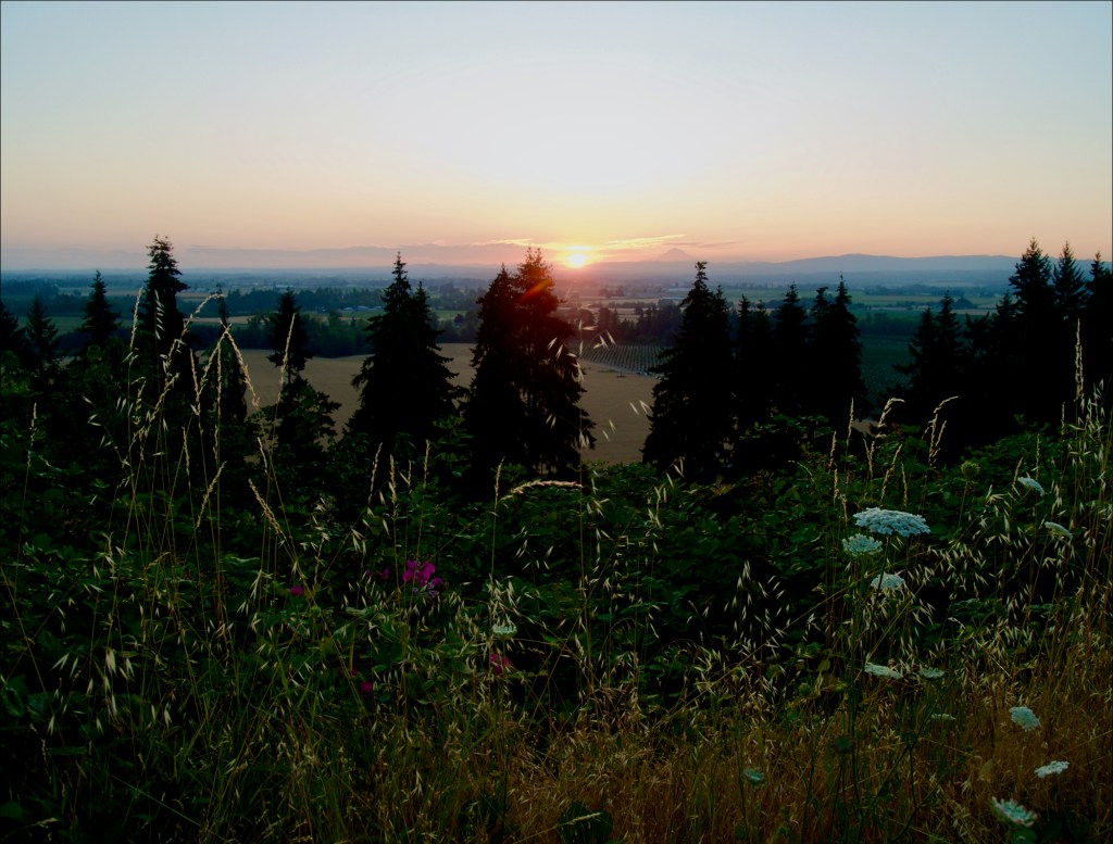 The mountain to the right of the sun is Mount Hood, which is visible from Mount Angel on clear days.